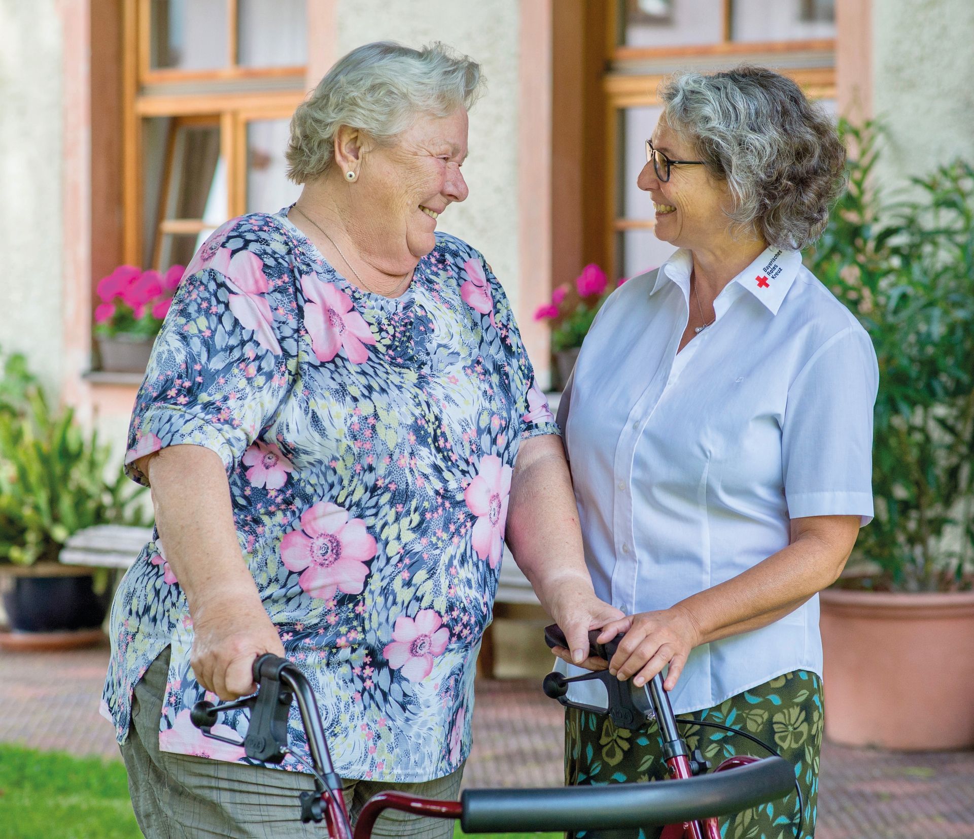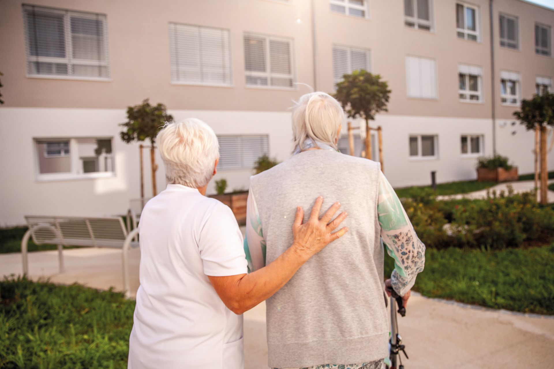 Stationsleiterin Sylvia Waletzko geht mit einer Bewohnerin im Garten spazieren. Zwischen blühenden Beeten und schattenspendenden Bäumen entsteht Raum für persönliche Gespräche, Erinnerungen und ein herzliches Lächeln.